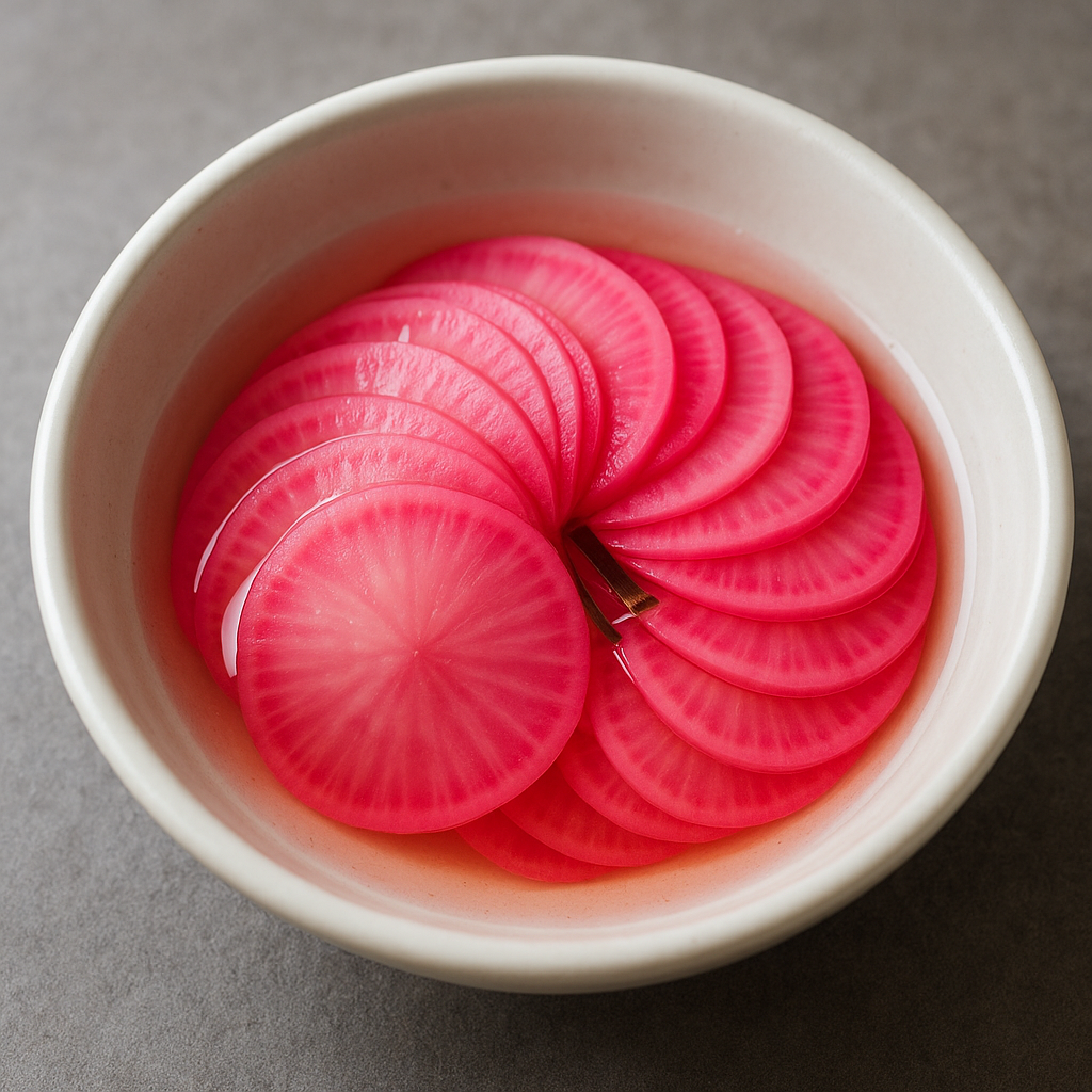 赤かぶのアントシアニンが甘酢に溶け、全体が淡い紅に。青森らしくりんご酢を一部使うと、ほのかな香りと丸い酸で仕上がります。